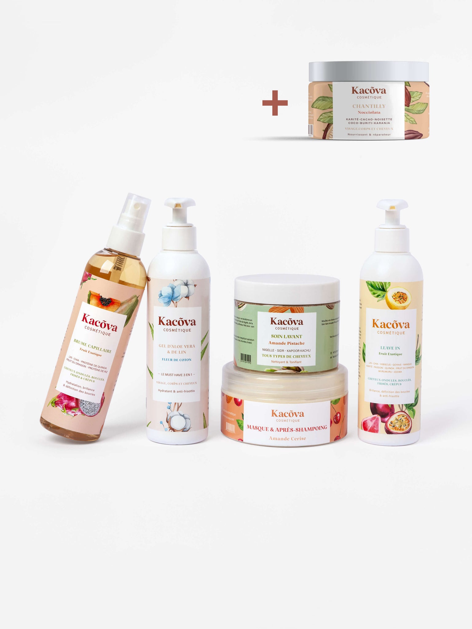 - En option : une chantilly 150ml au choix : une noix en fin de routine pour sceller l'hydratation, nourrir les cheveux et éviter les frisottis ou alors à laisser poser en bain d'huile avant le shampoing
